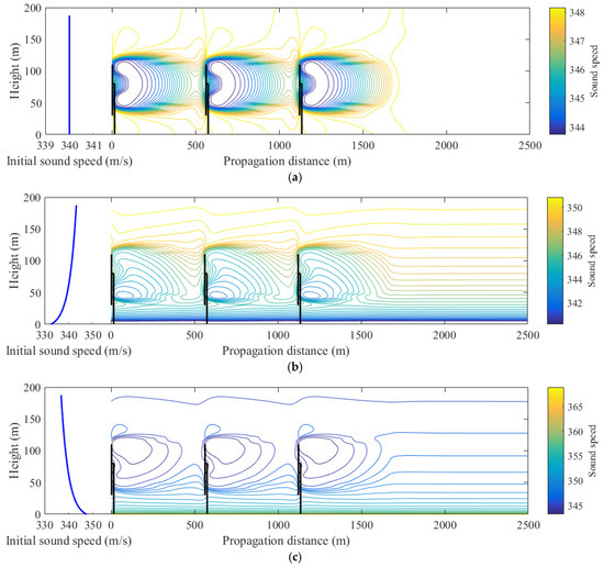 Although the flow and the noise source are modelled without wind and temperature gradients, in reality the effective sound speed profile will be affected by wind and temperature profiles. It was shown that the combinations of wind speed and temperature gradient forms different types of sound speed profiles [35]. Three idealized initial sound profiles are considered in the following sound propagation simulations. In Figure 12a, a uniform sound speed at temperature of 15 °C is assumed at the left boundary. The wind turbines are separated with a normalized distance of seven rotor diameters. For example, the second wind turbine is located at x = 560 m and the third wind turbine is located at x = 1120 m. Inside the computational domain, the sound speed is superimposed with the wind turbine wake field. Similarly, Figure 12b,c represent downward and upward sound speed contours. These sound profiles merge with the wind turbine multi-wakes and show distinct characteristics. The sound profiles have significant effects on wind turbine noise propagation as shown in the next subsection.