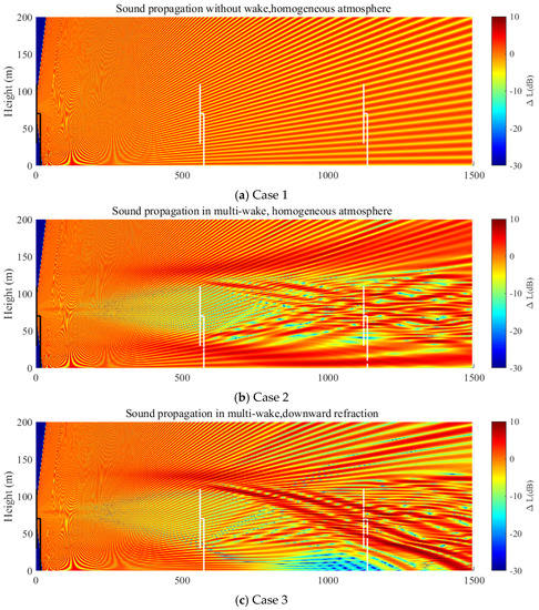 ANPropagation from the first ANSource: (a) Case 1, homogeneous atmospheric condition, no wake effect; (b) Case 2, homogeneous atmospheric condition with multi-wakes; (c) Case 3, downward refraction and multi-wakes; (d) Case 4, upward refraction and multi-wakes.