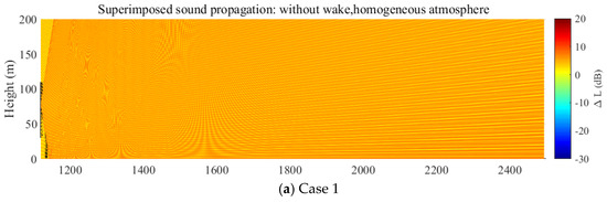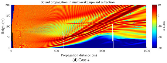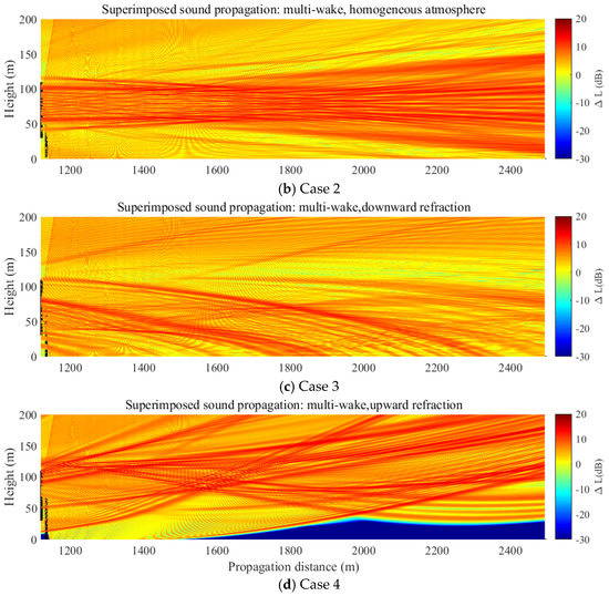 ANPropagation from all ANSources: (a) Case 1, homogeneous atmospheric condition, no wake effect; (b) Case 2, homogeneous atmospheric condition with multi-wakes; (c) Case 3, downward refraction and multi-wakes; (d) Case 4, upward refraction and multi-wakes.