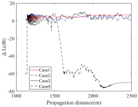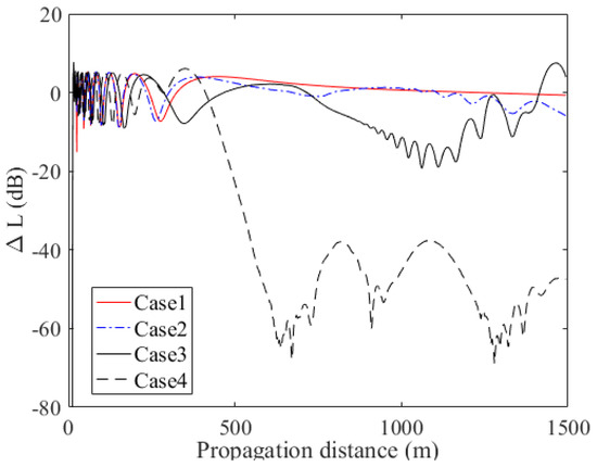 Figure 18 shows the RSPL or ∆L extracted from a line at 2 m high. The overall sound pressure variation for different cases is smaller as compared to the previous results shown in Figure 14. This is due to the mixing of three individually simulated propagation field. Among all the test cases, Case 3 can be regarded as the worst-case scenario. For example, around the distance of x = 1800 m, there is an obvious increase of SPL due the strong downward refraction at this region, which is also observed in Figure 16c at x = 1800 m.