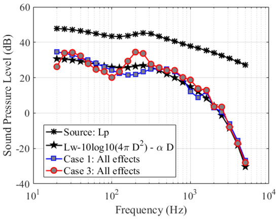 Result shown in Figure 14 represents the ∆L solely due to propagation which is computed at a fixed frequency of f = 300 Hz. Repeating the calculation for many frequencies and extracting the data at a receiver 1500 m away and 2 m height, a full spectrum of ∆L will be obtained. Using Equation (12) and considering all the effects (including ∆L), the SPL at receiver’s location under Case 1 and Case 3 is gathered and shown in Figure 15. Besides, the spectrum of ANSource and at receiver’s location (without ∆L) are also depicted in Figure 15. In this work, the ANSource is considered in an 1/3-octave band from 20 Hz to 5000 Hz. Since a minimal eight grid points are needed to resolve a sound wave, the grid number for high-frequency simulations increases sharply if the same domain size is adopted. For instance, there is a 100-fold increase in the grid number for frequency of 3000 Hz compared with that of 300 Hz. To reduce the computational effort, frequencies above 5000 Hz are not considered here. Another reason is that the noise reduction due to air absorption, in Equation (12), is much larger than the other factors at large frequency (f > 5000 Hz). The SPL at the source location is shown with black line with asterisk and labeled as ‘Source: Lp’ in Figure 15. The black lines with stars represent the SPL at receiver (2 m height at x = 1500 m) without considering the propagation loss ∆L in Equation (12). The blue line (Case 1) and red line (Case 3) consider all the factors, including geometric attenuation, air absorption and ∆L, in the long-path ANPropagation simulations. The big deviation between the two black lines demonstrates that the geometrical attenuation () contributes most to the ANPropagation loss. The even larger reduction of noise, when f > 1000 Hz, means that air absorption has a larger effect at high frequencies. The differences between blue/red lines and the black line with stars implies the value of ∆L. The value of blue and red lines are larger than that of black line with stars, which means positive ∆L near low frequency (f = 30 Hz). However, Case 1 and Case 3 show opposite ∆L around f = 200 Hz which implies the influences of wake and downward refraction.