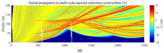 Similar as the previous simulations, the following study focuses on the noise propagation area between 1120 m and 2500 m, and a higher frequency f = 1000 Hz is selected. In this region, the three individual wind turbine noise sources propagate and superimpose on each other. In Figure 16a, the results cover the entire domain behind the last wind turbine. The solution differs from Figure 13a in the sense that it is the RSPL from all the three wind turbines. In Figure 16b, the uniform sound profile at the inlet boundary is affected by the multi-wake (see Figure 12a), such that the resulted RSPL is enhanced around wake center. With the prescribed sound profile of Figure 12b, the RSPL is refracted downwards, as shown in Figure 16c. Similarly, using the sound profile given in Figure 12c, the resultant sound propagation is refracted upwards, see Figure 16d.