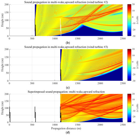 RSPL simulated at f = 1000 Hz and b = −3: (a) ANPropagation by wind turbine #1 downstream of the wakes of wind turbines # 1, 2, 3; (b) ANPropagation by wind turbine #2 downstream of the wakes of wind turbines #2, 3; (c) ANPropagation by wind turbine #3 downstream of the wakes of wind turbine #3; (d) superimposed RSPL from all wind turbines #1, 2, 3.