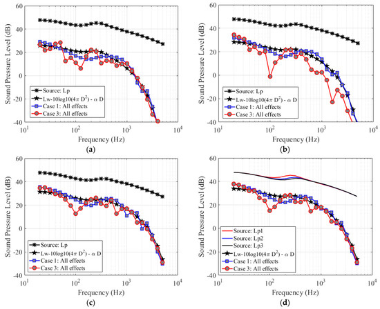 Receiver is fixed at x = 2500 m away from wind turbine #1, and the receiver height is 2 m. (a) SPL from wind turbine #1 (Source: Lp) to the receiver; (b) SPL from wind turbine #2 (Source: Lp) to the receiver; (c) SPL from wind turbine #3 (Source: Lp) to the receiver; (d) Total SPL from wind turbines #1, 2, 3 (Source: Lp1, Lp2, Lp3).