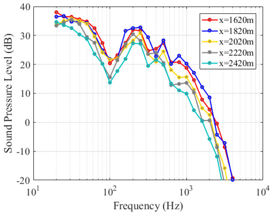 Finally, it is interesting to predict the noise spectra at different receivers. The receiver height is again fixed at z = 2 m, and the horizontal distances measured from wind turbine #1 are: x = [1620, 1820, 2020, 2220, 2420] m. The noise spectra are shown in Figure 20 and marked with different colors. The general trend is that the noise level decreases as observer distance increases. However, it does not always hold true at some distances and frequencies. For example, at x = 1820 m (22.75D), except at low frequencies, increase of noise level is observed as compared to the x = 1620 m case. The simulations show that the low frequency noise might be the major wind turbine noise source in the farfield. Since the spectra are obtained in farfield, the overall SPLs are quite low. According to the wind turbine noise regulations in many countries (such as 45 dB), the calculated noise evidently fulfill the limit. From the results, it is seen that SPLs over 1000 Hz is below 20 dB. For future studies, it is indicated that more focus should be paid on long-path ANPropagation at low frequencies.