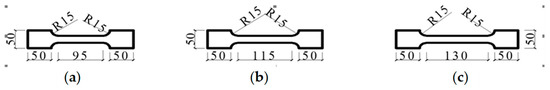Steel material samples (unit: mm). (a) Thickness of 6.5 mm; (b) thickness of 9 mm; (c) thickness of 14 mm.