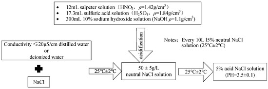 To obtain the mechanical properties of the corroded steel, such as the yield strength, the ultimate strength, the elongation, and elastic modulus, the tests were conducted based on standards. Then, the above-mentioned fundamental parameters to be used in the seismic analysis of the corroded frame beam were determined in this paper. The thickness of 6.5 mm, 9 mm, and 14 mm of steel plate was constructed according to the Chinese standard “steel and steel products—location and preparation of samples and test pieces for mechanical testing” [34]. The steel grade was Q235. The steel plate samples were corroded through the accelerated corrosion test that simulate an acid atmosphere environment. Each thickness of the steel material samples was divided into 8 sets, including 2 for each set as shown in Figure 1. Then, the steel material samples were placed in the ZHT/W2300 climate simulation experiment box for accelerated corrosion testing in an acidic atmosphere environment. According to the design code of China (GB/T 24195-2009) "Corrosion of metals and alloys—acceleration cyclic test with exposure to acidified salt spray, "dry" and "wet" conditions” [35], the acid salt spray was made, and the preparation process is shown in Figure 2. The specific design parameters of the material test are shown in Table 1.