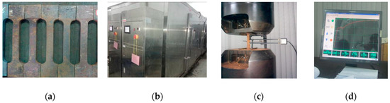 Test for the mechanical properties of steel under acidic atmosphere. (a) Steel material sample; (b) ZHT/W2300 corrosion box; (c) tensile test; (d) data collection.