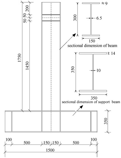 Based on the condition of the loading equipment and the measuring range of the instruments, a total of 6 steel frame beam specimens with a scale of 1:2 were designed by following the current Chinese standard [37,38,39]. The steel grade is the same as Section 2.1. The specific test parameters are shown in Table 2, and the beams and section dimension are shown in Figure 4.