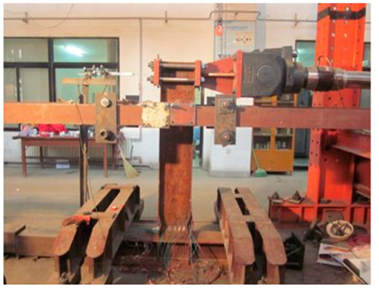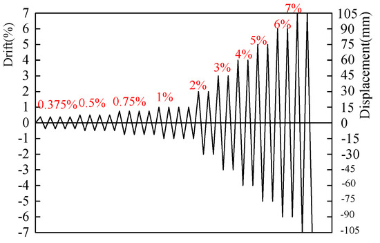 A cantilever beam was adopted in loading. The low cyclic loading device is shown in Figure 5. The lateral cyclic loading was applied by a 30 ton MTS actuator, and the base beam was fixed to the rigid ground by the pressure beam and anchor bolts. At the same time, the lateral support was added on both sides to prevent the out-of-plane instability of the beam specimen during loading, though the deflection may have been slight. The horizontal loading scheme was applied by referring to prior investigation [40]. The specimens were subjected to four successive cycles at the displacement drift of 0.375%, 0.5%, 0.75%, 1% respectively, after which followed two successive cycles at the displacement drift of 2.0%, 3.0%, 4%, 5% etc., until the horizontal load dropped to 85% of the peak load of specimens or until the load could not be continued because of the apparent damage, then the loading was stopped. The specific loading scheme is shown in Figure 6.