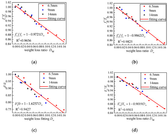 As can be seen in the above table, the deterioration of mechanical properties increased with the increase of the steel corrosion time. The longer the corrosion time of the steel, the greater the weight loss ratio. Additionally, the thicker the steel workpiece was, the less the weight loss ratio was. As the weight loss ratio increased, the mechanical properties of steel deteriorated continuously. The relationship of the weight loss ratio and the mechanical properties of the steel was obtained through the linear regression analysis of the above data. The fitting results and the regression expression are shown in Figure 7 and Equation (2), respectively.