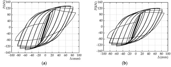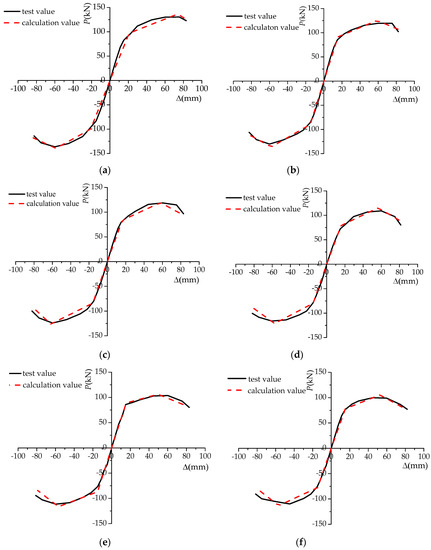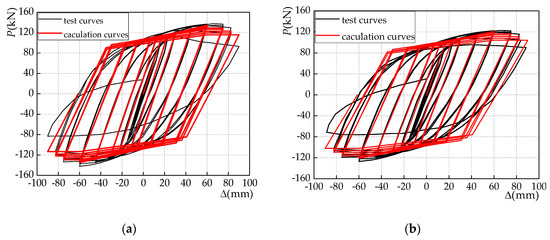 In order to verify the correctness of the restoring force model established in this paper, the hysteresis curve calculated according to the above method was compared with the hysteresis curve obtained by the experiment, and the results are shown in Figure 16, where the data of the specimen DB700 and TRS2A are used from Reference [42] and [43].