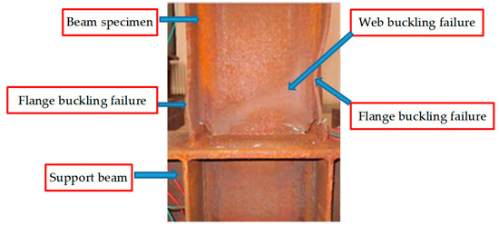 The maximum flexural capacity of B-2~B-6 specimens were obtained from Figure 8, as 128.35 kN, 123.81 kN, 110.68 kN, 102.07 kN, and 95 kN, respectively. By comparison with the B-1 specimen (136.9 kN) the decreased rates are calculated as 6.22%, 9.56%, 19.15%, 25.44% and 30.31%, respectively. At the same time, due to the buckling of the specimen bottom end flange, the web and the plastic hinge occurred, the lateral resisting stiffness of beam specimens was reduced. The typical failure model of the specimen is shown in Figure 9.