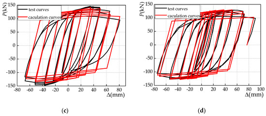 Comparison of calculation hysteresis curves and test hysteresis curves. (a) Specimen B-1; (b) specimen B-2; (c) specimen DB700; (d) specimen TRS2A.