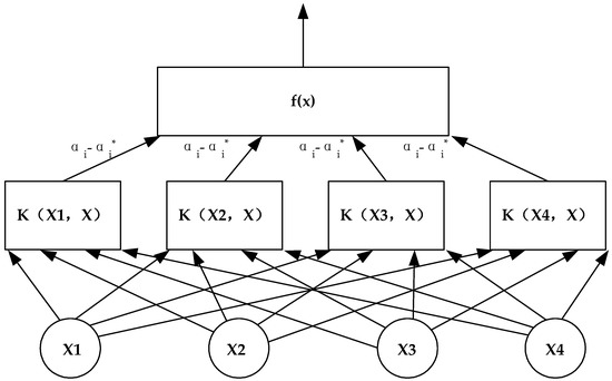 The structure of the SVM is similar to the neural network. The output is a linear combination of intermediate nodes, and each intermediate node corresponds to a support vector. To determine the optimal classification function, this study takes the four travel times of the time period before the prediction time as the input, namely , , , .