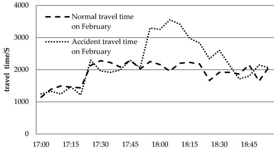 Figure 3 shows a comparison of travel time increased by an accident with normal travel time on the afternoon of 17 February.