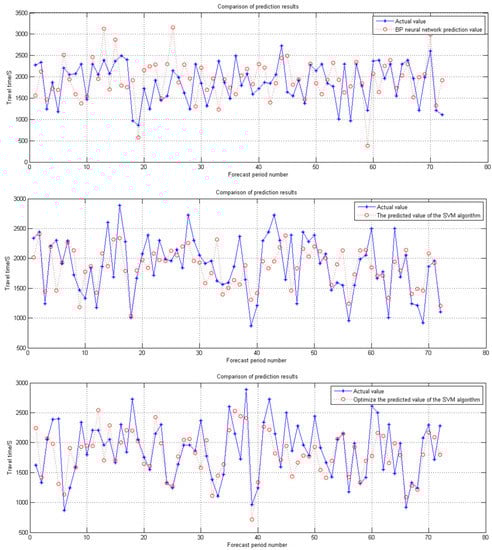 The prediction results also indicate that the optimized SVM model is superior to the BP neural network and SVM model in terms of the CP. In the prediction of Changsha West–Guanshan, the CP of the optimized SVM model is higher than those of BP model and SVM model by 21.40% and 7.28% respectively. In the prediction of Changsha West–Ningxiang, the CP of the optimized SVM model is higher than those of BP model and SVM model by 10.9% and 6.53%, respectively. The results proved that the optimized SVM model has better inclusiveness and stability when unexpected factors such as traffic accidents, thereby avoiding the need for repeated trial and error to address network problems.