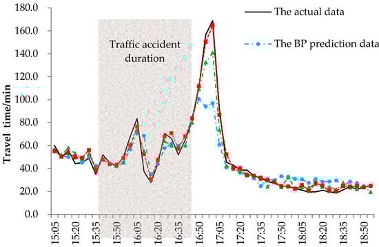 In order to reveal the effect of accidents on travel time, we used the BP, SVM, and the optimized SVM model to predict travel time from Changsha toll station to Guanshan toll station on G5513. One traffic accident took place at 15:40 and ended at 16:34 on 7th February 2018. The accident site located between these two toll stations. Travel time is listed in Figure 6, which includes the actual value, BP prediction value, SVM, and optimized SVM prediction value.