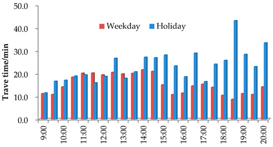 In this section, we compared travel time on holiday (21 February) with that on weekday (13 February). The study range is from Changsha toll station to Guanshan toll station on G5513. Travel time was analyzed from 9:00 to 20:00. Results of weekday and holiday are shown in Figure 7.