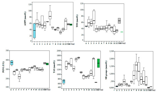 Oxidative stress status parameters after the addition of the tested compounds numbered from 1–12. Blank serum pool is signed as 0 (blue box); TBH—serum pool with prooxidant substance terc-buthyl-hydroperoxide (grey box) and serum pool with vitamin E as antioxidative substance (green box).