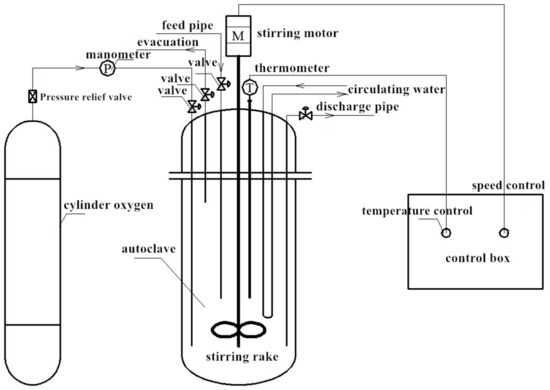 The catalytic experiments were carried out in a high-pressure reactor (HPR, Volumemax = 1 L, Pressuremax = 14.5 MPa, its structure is shown in Figure 1). All the catalytic experiments were carried out in a batch operation, and during each experimental circle, different amounts of AC-CoPcS catalyst was added into the reactor with 450 g SMM solution (18.0 wt%). Before the reaction, the air in the HPR should be replaced by oxygen. Then the control box of the HPR was turned on, and the stirring speed was fixed at 600 rpm. When the temperature in the reactor reached the desired value, the oxygen was inlet to start the catalytic reaction, which was labeled as the zero time point, and the reaction time was recorded accurately. After the reaction, heating electricity was turned off while cooling water was turned on until the temperature in HPR reached room temperature. Before opening the HPR, the exhaust valve was opened to get atmospheric pressure. The oily organic product of DMDS was separated by a separating funnel and was measured by an electronic balance (0.0001 g) to calculate the YieldDMDS. The initial and final concentration of SMM solution was determined by the iodometric method to calculate the CPPSMM. The principle of the iodometric method is that SMM was reacted by excessive iodine standard solution, and residual iodine was detected by sodium hyposulfite standard solution. The AC-CoPcS catalyst in the aqueous phase was filtered, washed by deionized water, and dried in a vacuum oven for reuse. All the catalytic experiments were conducted in triplicate and the statistical variance was found not to exceed five percent.