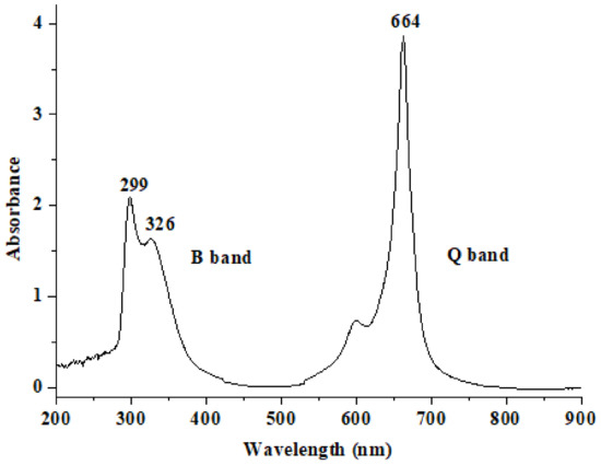 The UV−VIS and FT-IR were used to confirm the structure of the purchased CoPcS catalyst. The metal phthalocyanines and their derivatives have special absorption spectra in the ultraviolet and visible regions. That is the Q band of 600~800 nm and B band or Sorct band of 300–400 nm [31]. The UV−VIS spectra result of CoPcS catalyst is shown in Figure 2. The CoPcS have obvious absorption spectra in the B band and Q band with the maximum wavelengths located at 326 nm and 664 nm, which can be confirmed as the characteristic absorption peak of the CoPcS [32].