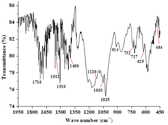 FT-IR result of CoPcS is shown in Figure 3, the peaks of 1716, 1542, 1510, and 1400 cm−1 corresponded to C=N stretching vibration, C–H bending vibration, C=C skeleton vibration in the benzene ring, and C-C stretching, respectively. We also found the peaks of 1120, 1053, 914, 732, and 717 cm−1 of CoPc reported by Seoudi et al. [33], and two characteristic peaks at 623 and 484 cm−1 owing to the phthalocyanine skeletal and cobalt ligand vibrations reported by Zhang et al. [34] confirming the structure of the CoPcS.
