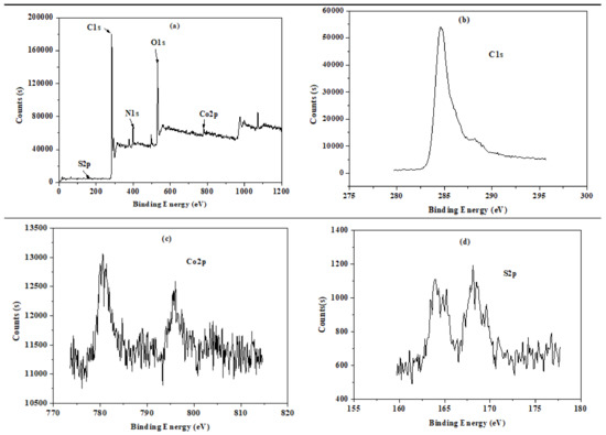 XPS was used to analyze the surface element and its chemical states of the AC-CoPcS catalyst, and the results are shown in Figure 4. The surface element of the AC-CoPcS is mainly carbon (C), oxygen (O), nitrogen (N), cobalt (Co,) and sulfur (S). This result indicates the fact that CoPcS was successfully combined into the AC through a chemical linkage of ethylenediamine because the Co and S appear in the XPS pattern of the new material. The CoPcS is very easy to dissolve in water, while the AC-CoPcS catalyst is well washed by deionized water after being prepared, so CoPcS appearing in the new materials cannot be physically adsorbed by the AC, but is chemically connected with it.