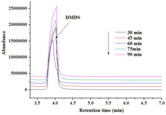 The GC-MS spectra of the DMDS product under different reaction time. Experimental conditions: SMM (18.0 wt%) 450 g, RR = 600 r/min, Cca = 888.9 ppm, Tre = 65 °C, P(O2) = 0.9 MPa.