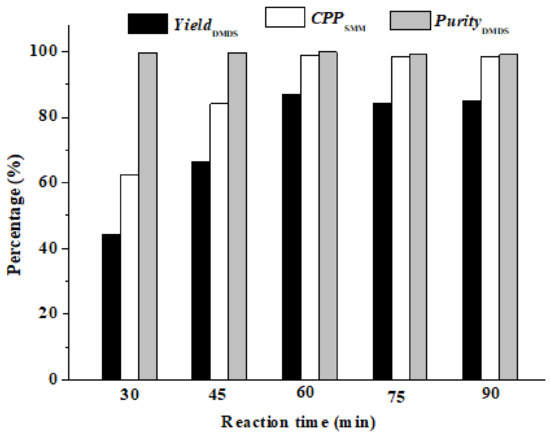 The reaction time is one of the most important process parameters that should be optimized firstly, so the effect of reaction time on CPPSMM, YieldDMDS, and PurityDMDS was investigated. The purity of the DMDS product was detected by GC-MS, and the spectra are shown in Figure 6. As can be seen, the retention time of DMDS is around 4 min, and there is no other peak of the byproduct in the GS-MS spectra, indicating the high quality of the DMDS is prepared by the new catalytic reaction system. As is shown in Figure 7, when the reaction time increases from 30 min to 60 min, the CPPSMM and YieldDMDS increase gradually from 62.4% and 44.1% to 98.7% and 86.8%, respectively. However, when the reaction time continues to increase from 60 min to 90 min, the CPPSMM decreases slightly to 84.1% at first and then remains nearly constant, while the YieldDMDS remains constant at the same time. Nevertheless, the reaction time seems have a little effect on the PurityDMDS, when the reaction time increases from 30 min to 90 min, the PurityDMDS decreases slightly from 99.8% to 99.1%, which verifies the high quality of the DMDS product that was prepared in the new system. As a result, the reaction time of 60 min is optimal, when the reaction time extends to 75 min or 90 min, the DMDS product may react with each other to form the byproduct, causing the decrease of YieldDMDS and PurityDMDS [30].