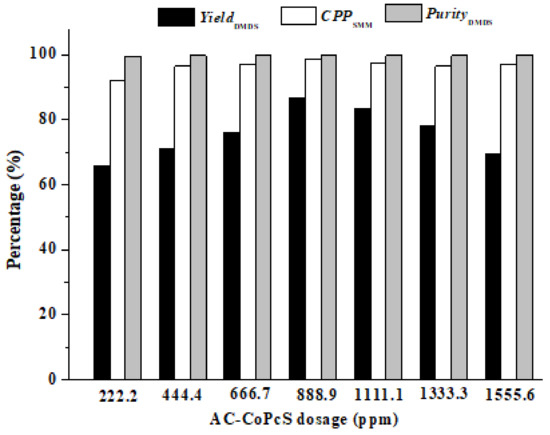 Figure 8 shows the effect of AC-CoPcS catalyst dosage (Cca) on CPPSMM, YieldDMDS, and PurityDMDS. The CPPSMM and YieldDMDS increase gradually when the Cca increases from 222.2 ppm (μg/g, 0.1 g/450 g) to 888.9 ppm and then begins to decrease continuously when Cca continues to increase to 1555.6 ppm. The optimum AC-CoPcS catalyst dosage is 888.9 ppm where maximum CPPSMM and YieldDMDS of 98.7% and 86.8% are achieved. When the Cca increases, the more active spot of the catalyst and reaction surface involves, so the reaction rate of Equation (6) process accelerates, resulting in a sharp increase of the CPPSMM and YieldDMDS at first. However, when it reaches, and even exceeds, the appropriate dosage, too much heterogeneous solid matter may hinder the gas-liquid mass transfer between SMM and oxygen, so the CPPSMM and YieldDMDS decrease gradually. However, Cca seems to have no effect on the purity of the DMDS product (Figure 8), and the PurityDMDS is nearly constant and its value of all the samples is above 99.5%.