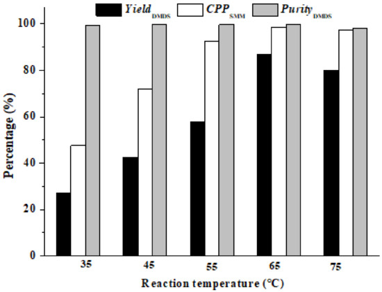 Commonly, the reaction temperature has a great influence on the reaction rate. The effect of Tre on the CPPSMM, YieldDMDS, and PurityDMDS was investigated when other operation parameters kept constant, and the result is shown in Figure 9. The CPPSMM and YieldDMDS increase gradually when Tre increases from 35 °C to 65 °C, but it decreases slightly when Tre continues to increase from 65 °C to 75 °C, so the optimum Tre is 65 °C where the best CPPSMM and YieldDMDS are achieved. The Tre seems to have little effect on PurityDMDS when it is lower than 65 °C, however, when Tre increases from 65 °C to 75 °C the PurityDMDS decreases sharply from 99.8% to 98.0%. The reason for these results is that the reaction of the SMM and oxygen is endothermal, and the reagents are easier to activate, which accelerates the reaction rate when Tre increases, leading to the increase of the CPPSMM and YieldDMDS. However, extremely higher Tre of 75 °C brings not only the byproduct formation problems, which will seriously affect the purity of DMDS product, but also the decrease of YieldDMDS because of the volatilization of DMDS into the gaseous state [6]. When Tre is at 75 °C, a white cotton-like byproduct in the organic layer was observed in the experiment.