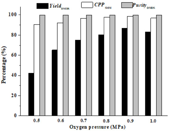 As is shown in Equation (6), the synthesis reaction of DMDS is a volume reduction reaction, so the increase of P(O2) will benefit the process. The effect of P(O2) on the CPPSMM, YieldDMDS, and PurityDMDS was investigated, and the result is shown in Figure 10. As is shown in the figure, the YieldDMDS increases sharply from 42.5% to 86.8% with the P(O2) increasing from 0.5 MPa to 0.9 MPa, and it decreases slightly at 1.0 MPa. However, at the same time, the CPPSMM only increases from 90.5% to 98.7% when the P(O2) increases from 0.5 MPa to 0.9 MPa, and then also decreases slightly to 96.8% when P(O2) continues to increase to 1.0 MPa. These results indicate the fact that SMM is much easier to react with oxygen, but the reaction condition is much harsher to obtain a high yield of the DMDS product. Nevertheless, the purity of the DMDS was not affected by the P(O2), and the PurityDMDS is still as high, above 99.5%.