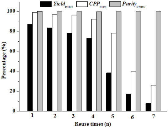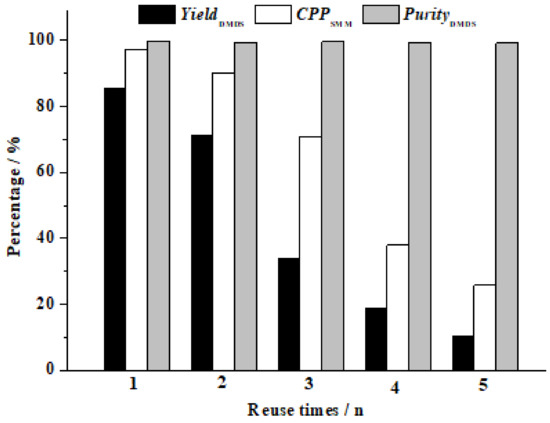 The most important advantage of the supported catalyst is its reusability. The reuse performance of the commercial and newly prepared AC-CoPcS catalyst is shown in Figure 11 and Figure 12. As can be seen in the figures, CPPSMM and YieldDMDS decrease with the increase of reuse times of the two catalysts. For the new AC-CoPcS catalyst, it can be reused seven times, and for the first four times of reuse the CPPSMM and YieldDMDS only reduce from 98.7% and 86.8% to 92.0% and 72.7%, respectively. However, the significant decrease of the CPPSMM and YieldDMDS occurs at the fifth reuse of the new catalyst of 78.2% and 46.6%, and the CPPSMM and YieldDMDS is only 26.2% and 8% for the seventh reuse. The reuse performance of the commercial AC-CoPcS catalyst is slightly worse than the former one. It can only be reused five times. The CPPSMM and YieldDMDS decrease from 97.4% and 85.6% to 90.2% and 71.3% for the second reuse, but decrease to 70.8% and 33.9% for the third reuse. As a result, the new and commercial AC-CoPcS catalysts can be properly reused four and two times, respectively, which still can achieve relatively high YieldDMDS and CPPSMM of more than 70% and 90%. It is worth mentioning that the reuse times have little effect on the PurityDMDS. The PurityDMDS of all the DMDS product remains above 99.3%. The decrease of catalytic performance of AC-CoPcS catalyst with the increase of reuse times can be attributed to the following reasons: Firstly, the more times AC-CoPcS catalyst is reused, the greater loss of its active components during the reaction process of high temperature and high pressure; secondly, the SMM reagent, DMDS product, or even the byproduct produced in the reaction may be absorbed by the AC carrier, which can block up the micropores of the AC, preventing the reagents and catalyst from contacting with each other; and, thirdly, the mechanical strength of the AC carrier will also drop, resulting in its hole collapse, which also reduces the connection of active spots of the catalyst with the reagents [30].