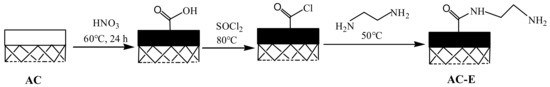 Activated carbon (AC) was washed with deionized water and dried to have 10.0 g of AC which was added to a 250 mL beaker that contains 150 mL nitric acid solution (V(HNO3):V(H2O) = 1:2). The reaction mixture was stirred at 60 °C for 24 h. The product was then washed with deionized water to neutralize and dried in vacuum oven at 105 °C to obtain nitric acid-treated AC (AC-T). Then 2.0 g AC-T and 5 mL SOCl2 were added into a flask. The reaction mixture was heated at 80 °C for 12 h. After the reaction, the mixture was heated up to 130 °C to evaporate residual SOCl2 and cooled down to room temperature (25 °C). The product was added to 100 mL DMF which dissolved 5 mL EDA and reacted at 50 °C for 8 h. After cooling to room temperature, the product was washed with deionized water, DMF, and absolute ethyl alcohol, respectively, several times, and then dried in a vacuum oven at 105 °C to obtain AC-E. The synthetic process is illustrated in Scheme 1.