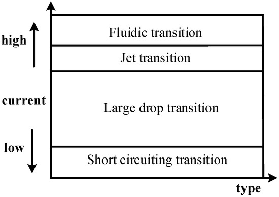 The globular transfer mode is essentially open-arc welding, and it has lower levels of current compared to spray transfer. As shown in Figure 2, the welding current of the spray transfer mode increases in proportion with the surface tension of molten metal, and this mode uses higher currents than several other modes of transfer. This mode of transfer is suitable for settings with low base voltages and high peak currents [21]. The streaming transfer mode leads to higher currents, lower droplet volumes, and formation of axial droplet columns. If the current exceeds 300 A, the electrical resistivity of the transfer process increases. The control of current in pulsed transfer is performed by switching between globular transfer and spray transfer [22].