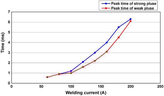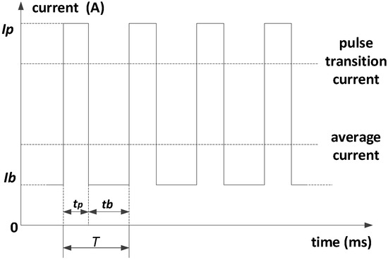 Pulsed MIG welding is an important breakthrough in welding technology, as it has eliminated numerous constraints of constant-current welding techniques. Moreover, the advent of this technology has provided a new direction for research and development in the field of arc welding [19]. The energy used by pulsed MIG welding can be controlled by adjusting time and current parameters. This ensures that low current will be used during the welding of aluminum alloy plates, in accordance with the requirements of aluminum alloy processing [20]. The relationship between current and the transfer mode of double-pulsed MIG welding is illustrated in Figure 1.