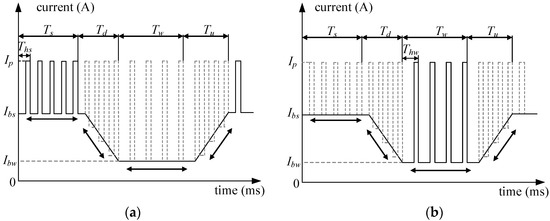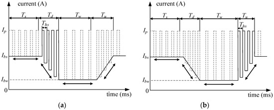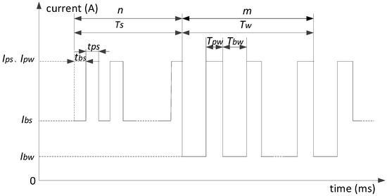 The calculations show that the total number of high- (low-) energy pulse trains will decrease with increases in tbw and tbs, if Tw and Ts are fixed. Therefore, if the current is to be limited to lower values, it is necessary to reduce n and m while appropriately increasing tbw and tbs. In addition, the dependence of current on the number of pulses must be closely monitored to minimize the latter’s impact on current.