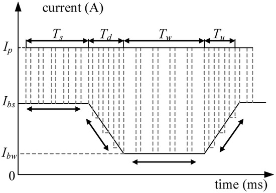 The analysis of low-frequency modulation signals includes two aspects: peak values and base values. If the peak values are stable, low-frequency modulation may be performed using Ip. The change in base current along the four aforementioned modes of transfer is shown in Figure 4. Td and Tu are the low- to high-energy and high- to low-energy pulse transition times, respectively, and Td = Tu. In Figure 4, Tl is the time required to complete the processes of low-frequency modulation, and the corresponding frequency is . Hence, the time, t, at which the interval [0, Tl] lies in the low-frequency period is as follows: