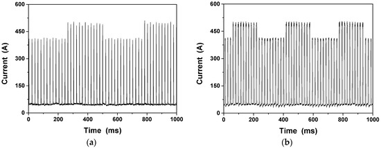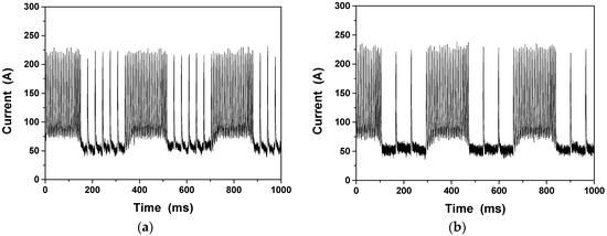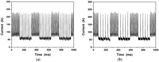 TP-MIG current waveform diagram of different number of pulses in the low-energy pulse train: (a) Average current of 88 A; (b) Average current of 80 A.