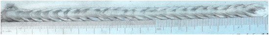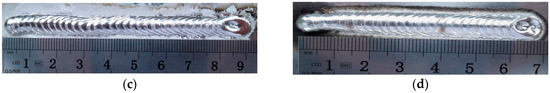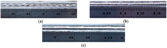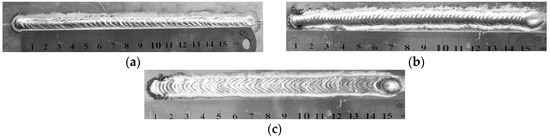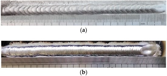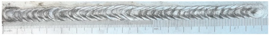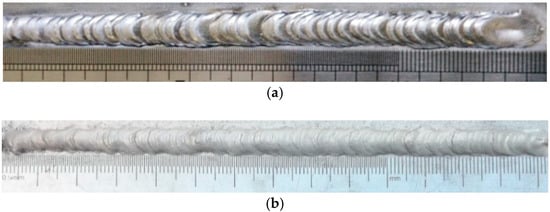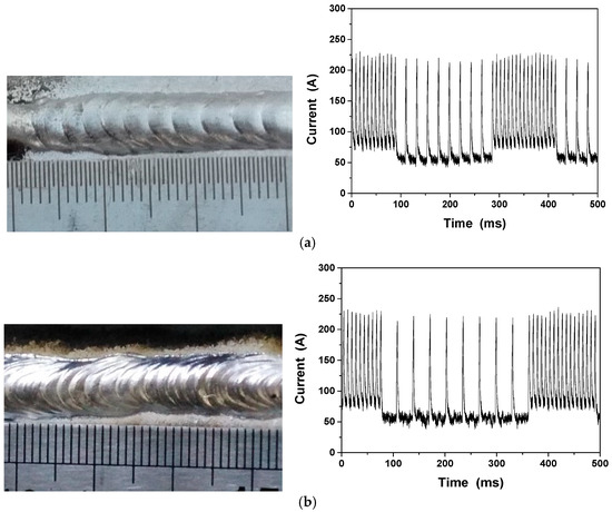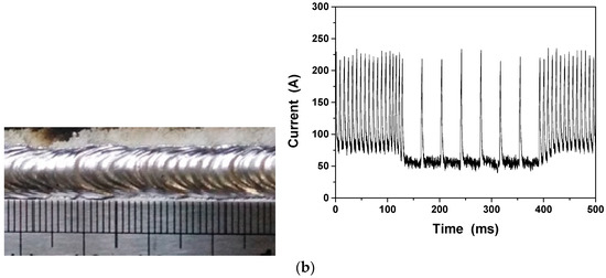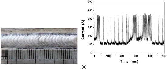 Two TP-MIG welding experiments were also conducted at the same welding speed (0.6 m/min), and the parameters are listed in Table 5. The superficial morphologies of the welds formed in these experiments and their corresponding current waveforms are shown in Figure 18.