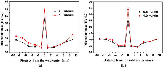Hardness distribution of welded joints at two speeds: (a) Comparison of DP-MIGW hardness of welded joints; (b) Comparison of TP-MIGW hardness of welded joints.