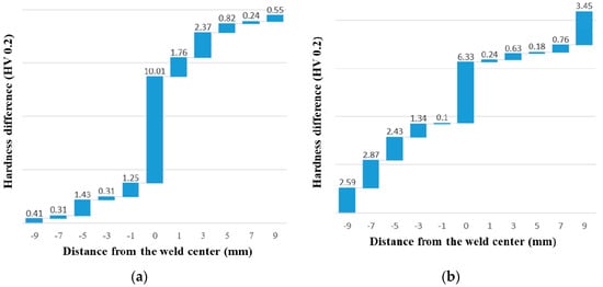 Difference in the hardness of welded joints at two speeds: (a) DP-MIGW hardness of welded joint; (b) DP-MIGW hardness of welded joint.