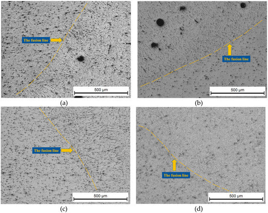 Microstructure photograph of welded joints: (a) DP-MIGW, 0.6 m/min, (b) DP-MIGW, 1.0 m/min, (c) TP-MIGW, 0.6 m/min, (d) TP-MIGW, 1.0 m/min.