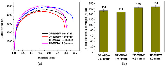 Figure 25 shows the tensile curves and the ultimate tensile strength of the welded joints. The ultimate tensile strength of DP-MIG joints obtained at the welding speeds of 0.6 m/min and 1.0 m/min is 154 MPa and 148 MPa, respectively. The ultimate tensile strength of TP-MIG joints obtained at the welding speeds of 0.6 m/min and 1.0 m/min is 165 MPa and 168 MPa, respectively, which is better than the tensile results of DP-MIG joints.