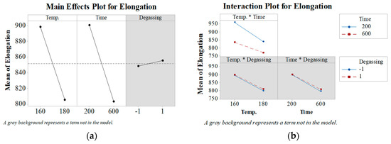 Figure 2 shows the plot of the major factors that determine elongation. Time and temperature affect elongation, and gas removal has a minor effect on elongation. Figure 2b shows the diagram of the interactions. It can be confirmed that temperature and time affect each other.
