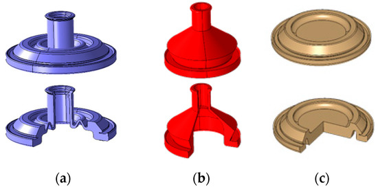 We derived the process parameters that increase mounting performance by measuring mounting performance according to grommet shape. Based on the results described in the previous section, temperature and time were set as the process parameters because they affect tensile strength and elongation. We set the maximum and minimum values for each factor according to grommet shape and fabricated the grommet. Here, degassing was applied in the fabrication of all products. The mounting performance of the products was analyzed by measuring the insertion force required for fastening the grommet and the required separation force. Insertion force and separation force were measured using a universal tensile tester when the grommet was inserted into or removed from a panel fixing jig. The experimental speed was set as 50 mm/min, and the experiment was repeated twice. We employed three widely used types of shapes for the grommet. The temperature and time parameters for molding the grommet of each shape in the initial test are shown in Table 4. Figure 3 shows the types of grommet shape.