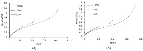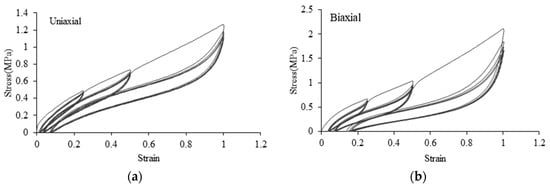 Unlike metals, rubber retains its elasticity even under large strain. As rubber has hyper-elastic properties that exhibit nonlinearity between load and strain, it is important to understand its nonlinear properties [15]. We conducted uniaxial and biaxial tensile tests of EPDM rubber to obtain stress–strain rate information. Then, we determined the nonlinear material constants required for finite element analysis. The uniaxial and biaxial tensile tests were performed using an EPDM 50 material to obtain stress–strain data, as shown in Figure 6. We determined the material constants required for nonlinear analysis. The tensile test was performed using the KS standard dumbbell-type three test [13]. The Mullins effect is observed in EPDM materials, such as rubber, in which the initial molecular structure is rearranged upon repeated loads [16,17,18,19]. As shown in Figure 6a,b, as strain range gradually increases, if a strain larger than the previously applied strain is received, a certain permanent strain occurs and strain does not become zero, even if stress is zero. In addition, while the gauge distance of a specimen increases in the repeated loading process, the cross-sectional area decreases.