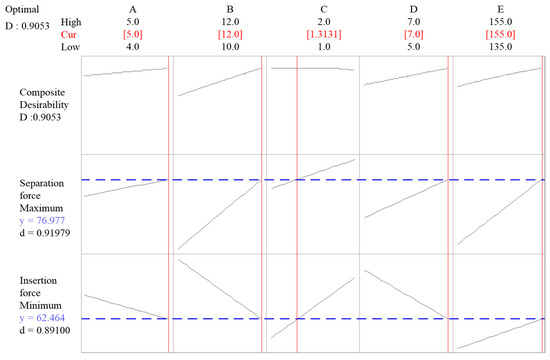 We derived the shape parameters for minimizing insertion force and maximizing separation force based on the results obtained from the nonlinear analysis. Large values were obtained for shape parameters a, b, d, and e and a value of 1.313 was obtained for c. Insertion force and separation force were predicted as 62.46 N and 76.98, respectively. Figure 9 is an optimization graph that shows insertion force and separation force according to the values of each shape parameter obtained using the response surface optimization [23].