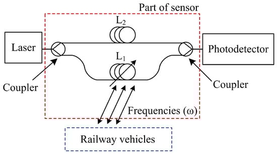 Light interference in optical fibers was selected as an underlying phenomenon because it is highly sensitive and allows frequency changes from several Hz to several kHz to be monitored. Figure 1 shows a simplified scheme of the interferometric sensor used based on the two-armed Mach–Zehnder interferometer. A passing railway vehicle near a sensor (Figure 1) causes a response () with low frequencies in the range of several Hz up to hundreds of Hz [35,36,37]. This vibration and acoustic response excite the measurement fiber of the interferometric sensor and cause a change in its optical length, or more precisely, the product of its refractive index nand geometric length L. The resulting phase change is given by the phase changes of the light source () and the changes in the length of the arm and its refractive index (). The phase changes of the source () occur in both arms of the interferometric sensor (reference and measurement arms), and one is subtracted from the other, while the phase changes due to a vibration source () that contain information about measured frequencies () caused by a passing railway vehicle only occur in the measurement arm of the interferometric sensor.